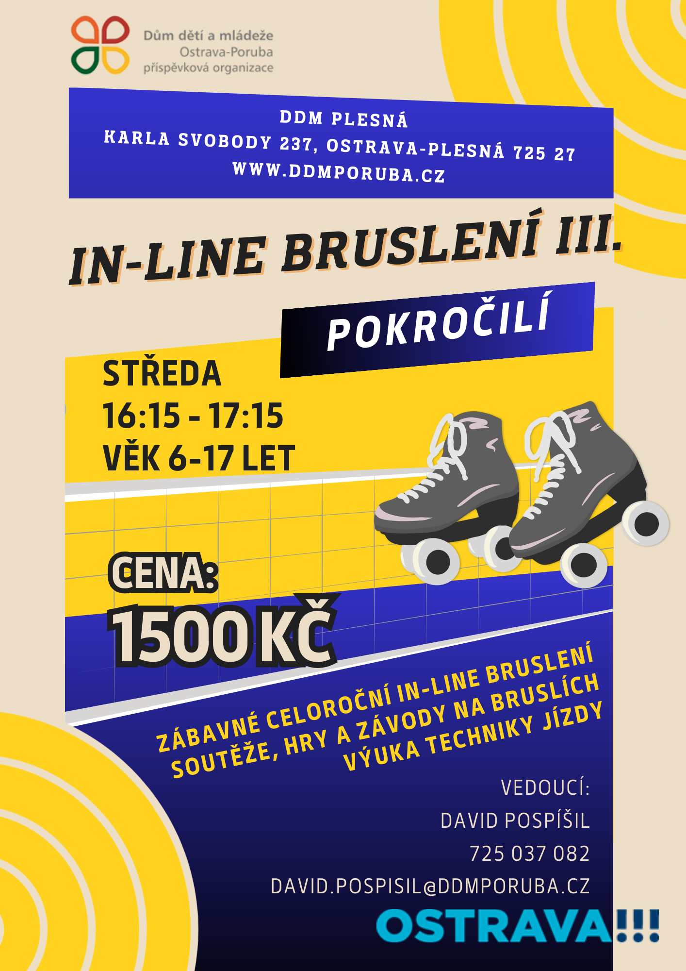 Nácvik základních prvků inline bruslení (postoje, pády, vstávání, jízda vpřed), technika brždění, jízda vzad, zatáčení, prvky freestyle slalomu a hry na bruslích. |